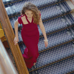 A refined evening gown with a high neckline and delicate cutout details, offering a perfect blend of elegance and modernity. The open-back silhouette enhances its sophisticated appeal, while the expertly tailored fit provides both comfort and structure. Designed for formal events, galas, and special occasions.