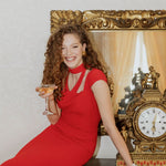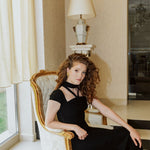 A refined evening gown with a high neckline and delicate cutout details, offering a perfect blend of elegance and modernity. The open-back silhouette enhances its sophisticated appeal, while the expertly tailored fit provides both comfort and structure. Designed for formal events, galas, and special occasions.