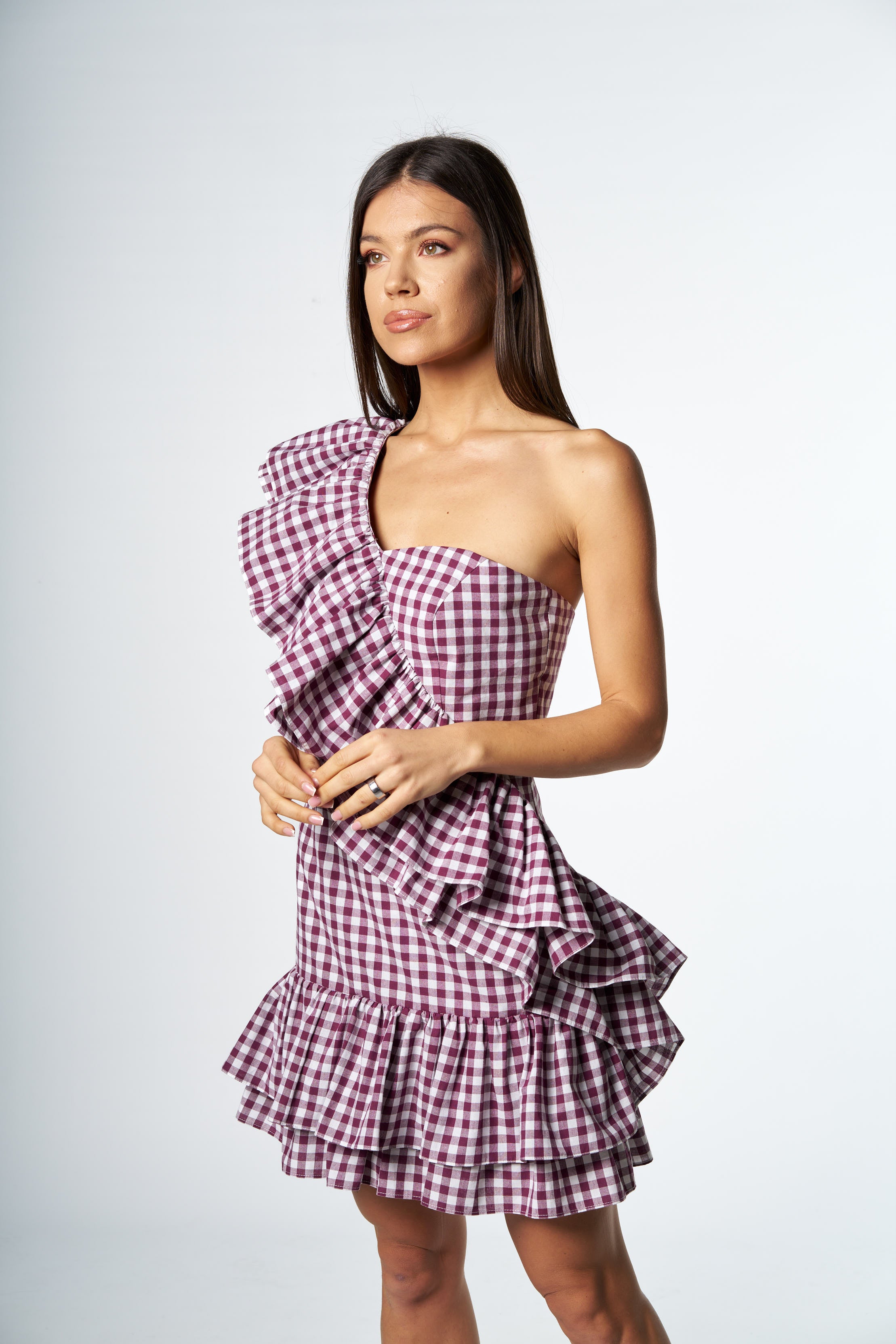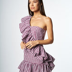 A playful summer mini dress designed with a striking one-shoulder silhouette and cascading ruffle details. The fitted shape highlights the feminine form adds a charming, timeless touch.