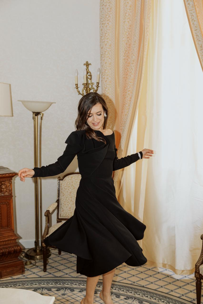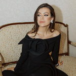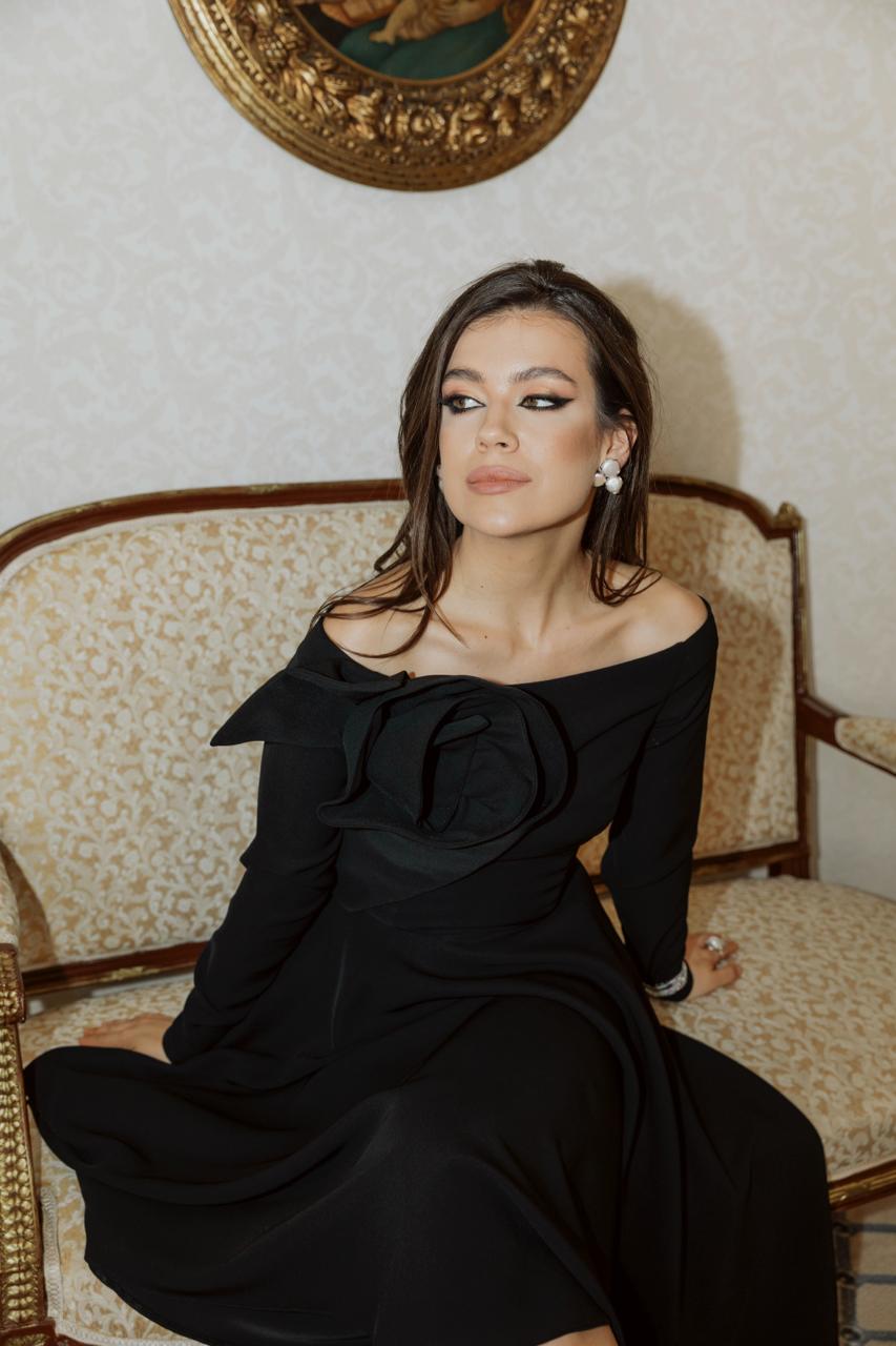 A refined evening dress with an asymmetrical neckline and a statement sculptural rose detail on the shoulder. Designed with a tailored silhouette and flowing skirt, this piece offers a balance of elegance and modern sophistication. Ideal for formal events, cocktail parties, and special occasions.