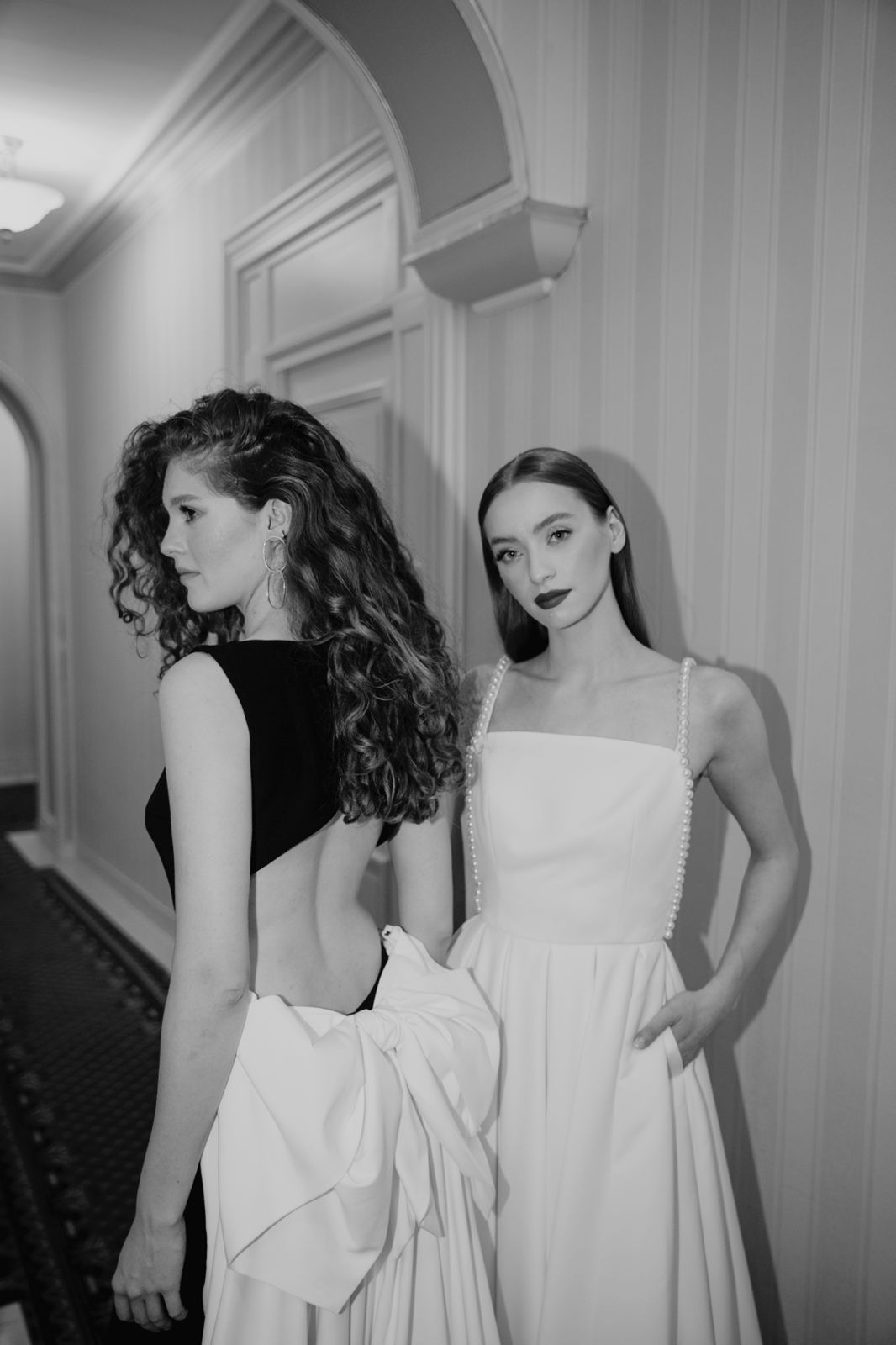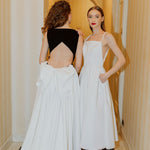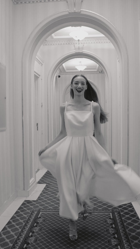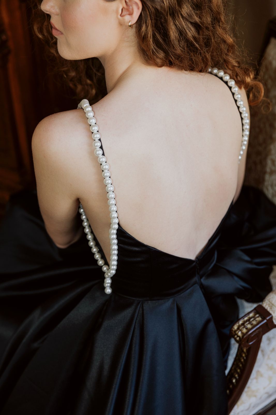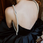 A timeless gown designed with a structured bodice and a flowing A-line skirt. The delicate pearl detailing along the open back adds a refined touch, balancing elegance with modern sophistication. Perfect for formal events and special occasions.