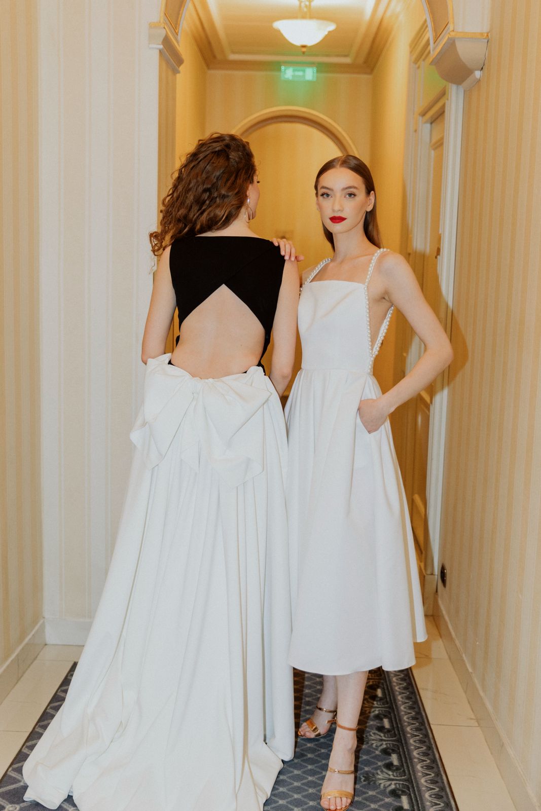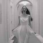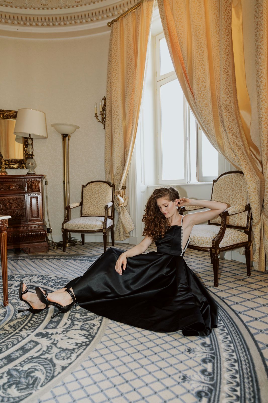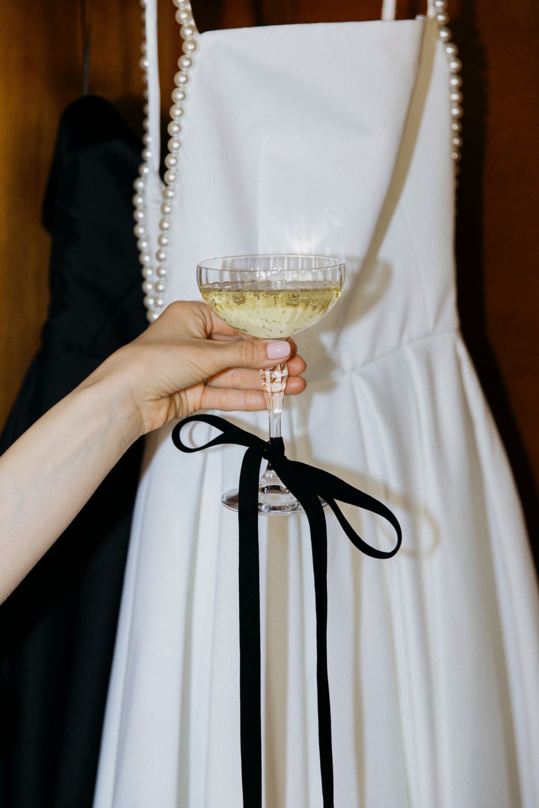A timeless gown designed with a structured bodice and a flowing A-line skirt. The delicate pearl detailing along the open back adds a refined touch, balancing elegance with modern sophistication. Perfect for formal events and special occasions.